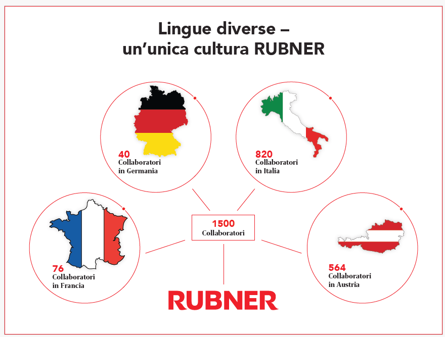 La cultura aziendale è inoltre influenzata dalla storia dell’Alto Adige: l’apertura verso altre culture e la diversità linguistica hanno offerto importanti opportunità di sviluppo internazionale, che tuttora rappresentano un valore distintivo. Aziende e dipendenti provenienti da diversi paesi, lingue e culture trovano nel Gruppo Rubner un’identità comune.